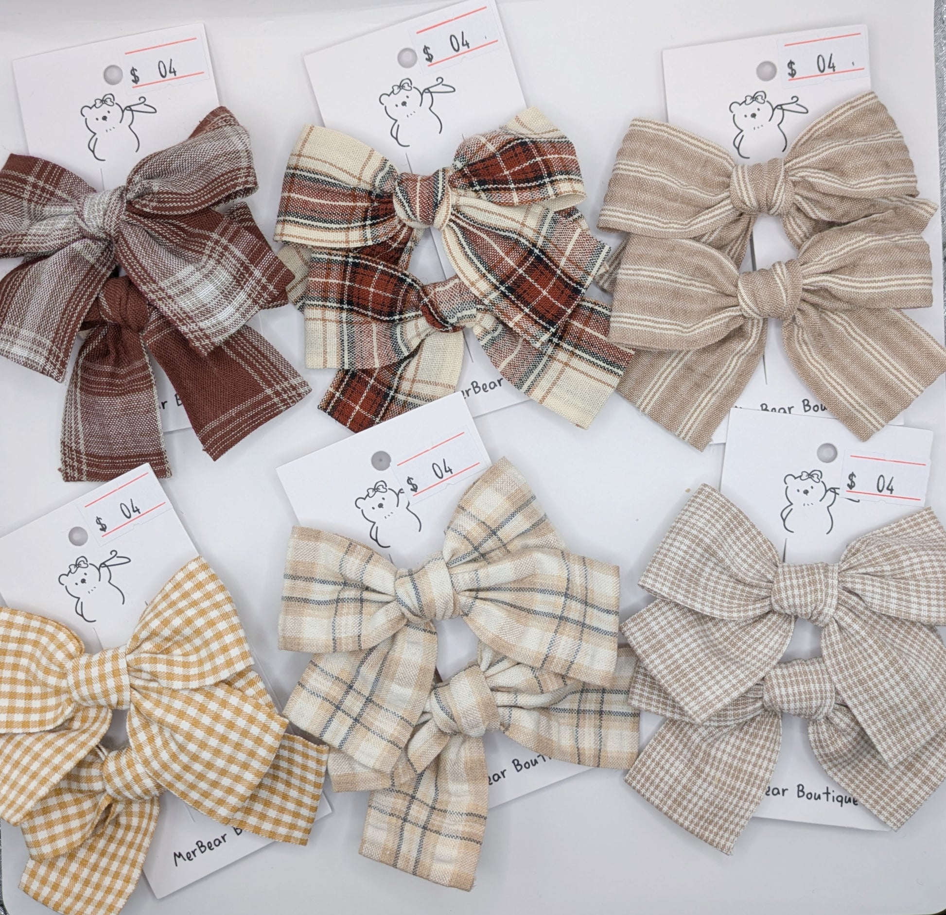 Bring a cozy, timeless feel to your little one's look with our Plaid Bow Clips! Featuring a variety of warm neutral tones and classic patterns, these bows are perfect for everyday styling or adding a rustic touch to special occasions. Made from soft, durable fabric with a strong clip for all-day hold, they’re as practical as they are adorable.