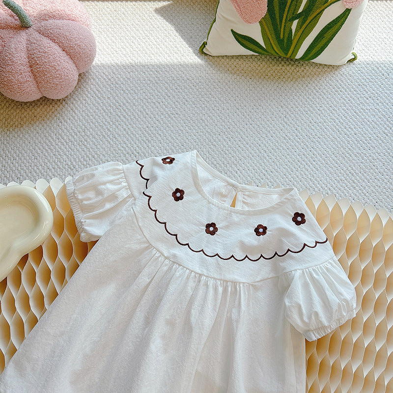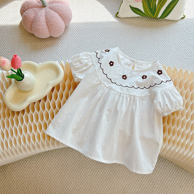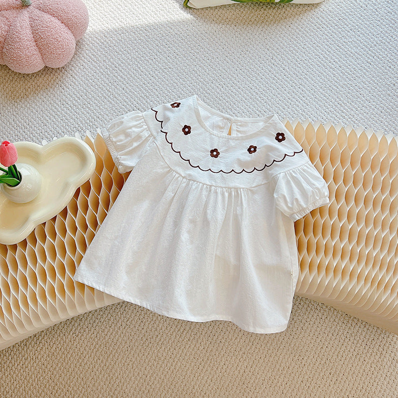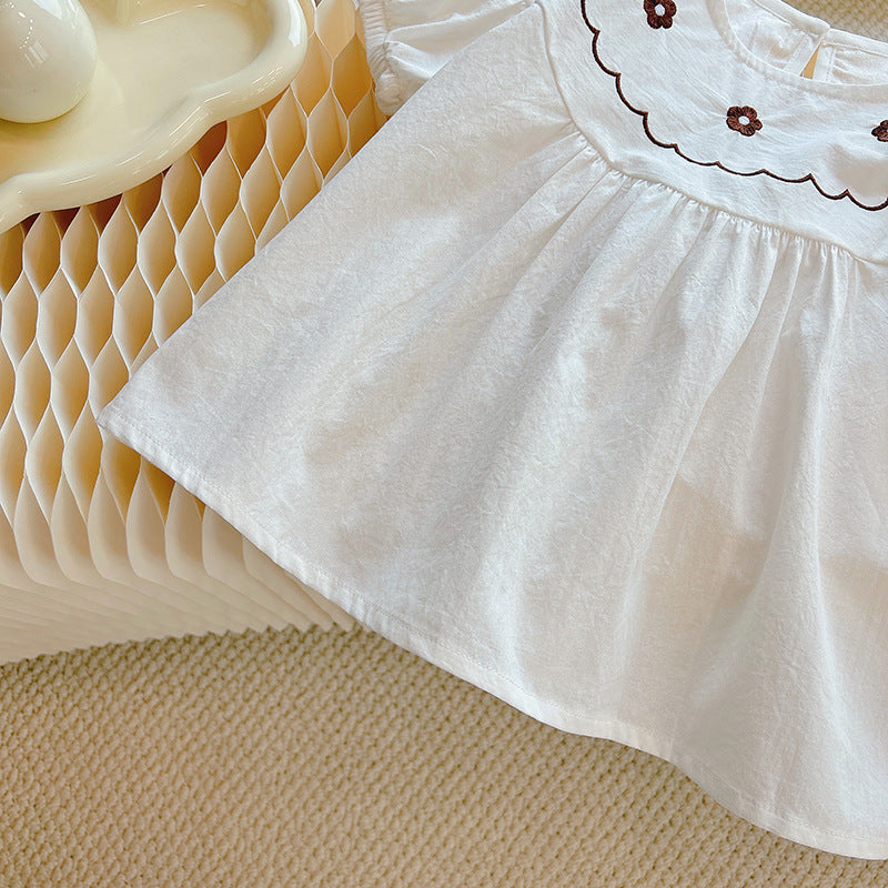 Sweet and timeless, this embroidered yoke blouse is a must-have for your toddler girl’s wardrobe. Made from soft, breathable cotton, this white puff-sleeve top features delicate floral embroidery and a scalloped neckline in chocolate brown. The loose, flowy fit ensures all-day comfort while adding a touch of vintage charm. Perfect for pairing with skirts, denim, or wide-leg pants.