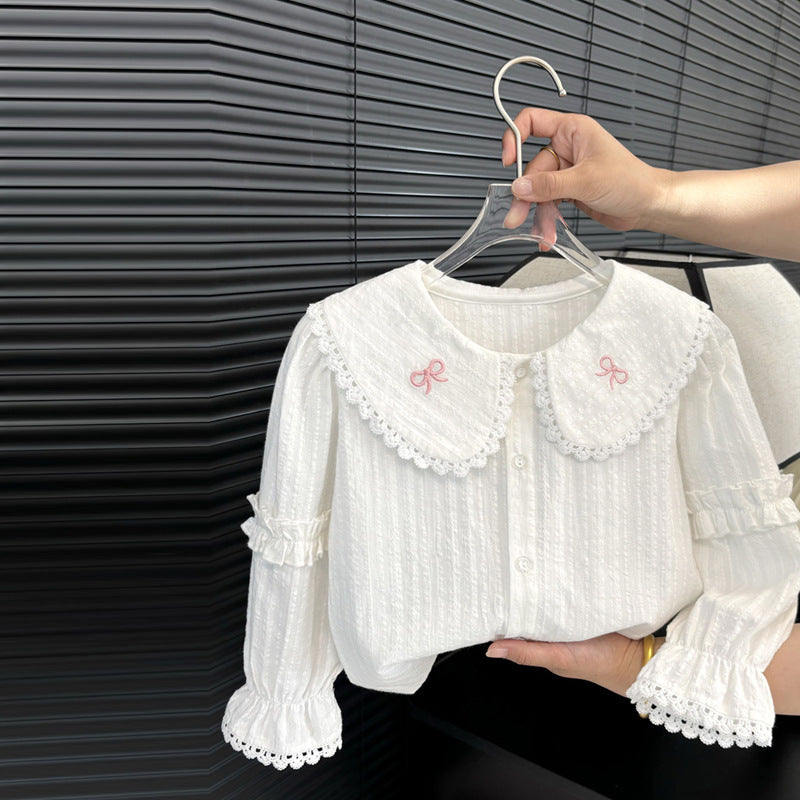 Add a touch of vintage elegance to your little one's wardrobe with our Embroidered Lace Collar Blouse. Featuring delicate lace trim, embroidered bow details, and sweet ruffle accents on the sleeves, this blouse is perfect for any special occasion or stylish everyday wear. Crafted from soft, lightweight fabric for maximum comfort and charm.