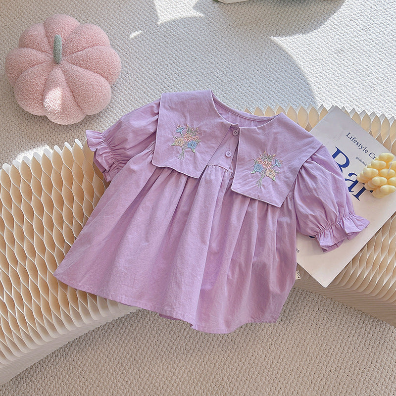 Keywords: lavender toddler blouse, floral embroidered collar shirt, puff sleeve toddler girl top, vintage toddler fashion 2T–6T, pastel spring toddler clothes
