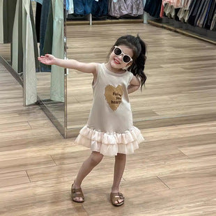Let your little one shine in our Heart Ruffle Hem Tank Dress. This adorable dress features a golden heart detail with the sweet message "Follow My Heart" and playful ruffle accents along the hem. Made from soft, lightweight fabric, it's perfect for warm-weather outings, beach days, or any casual adventure. The sleeveless design allows for easy layering, making it both stylish and versatile.