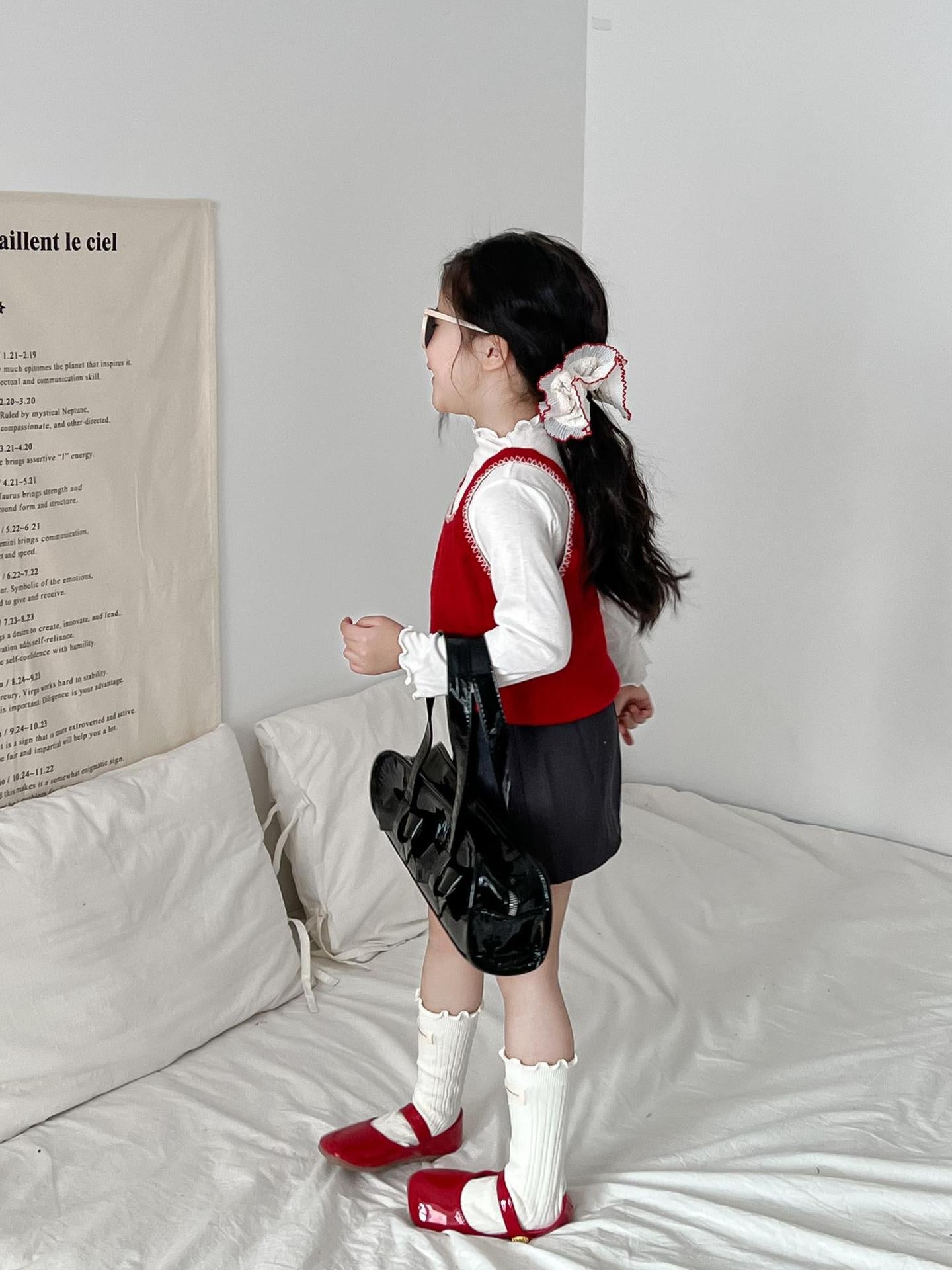 Make a bold statement with our Red Knit Vest & Skirt Set. This stylish outfit features a vibrant red knit vest layered over a classic white long-sleeve top, perfectly paired with a sleek charcoal gray skirt. Designed for the little fashionista, this set is both chic and comfortable, making it ideal for special occasions, playdates, or stylish everyday wear.