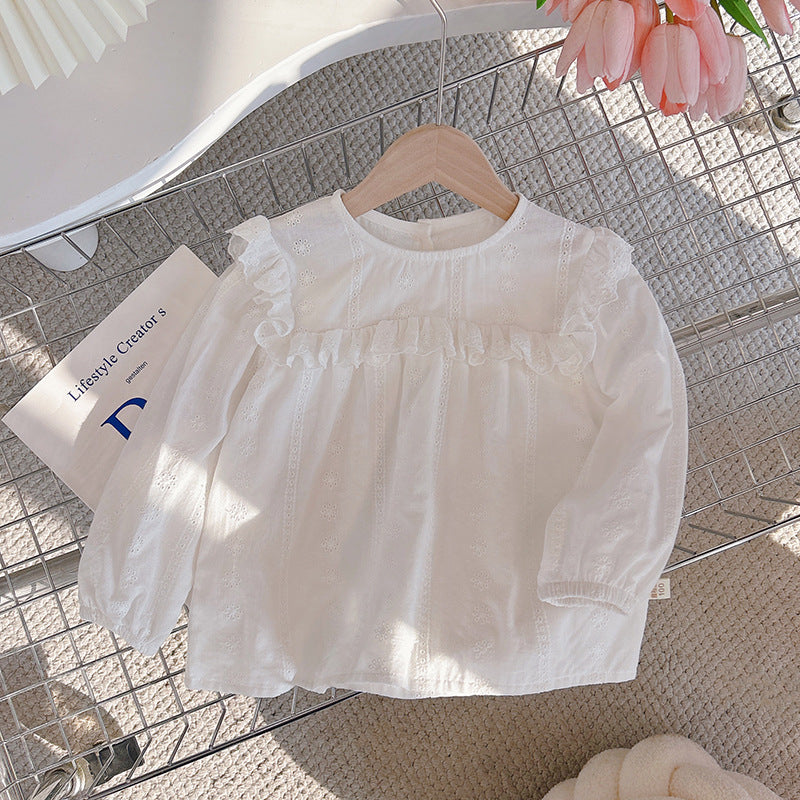 Delicate and timeless, our White Eyelet Ruffle Blouse is perfect for any little fashionista. Crafted from breathable cotton with embroidered eyelet detailing and soft ruffle trim across the chest and shoulders, this long-sleeve blouse is ideal for layering or wearing on its own. Its relaxed silhouette ensures all-day comfort with a sweet vintage look.