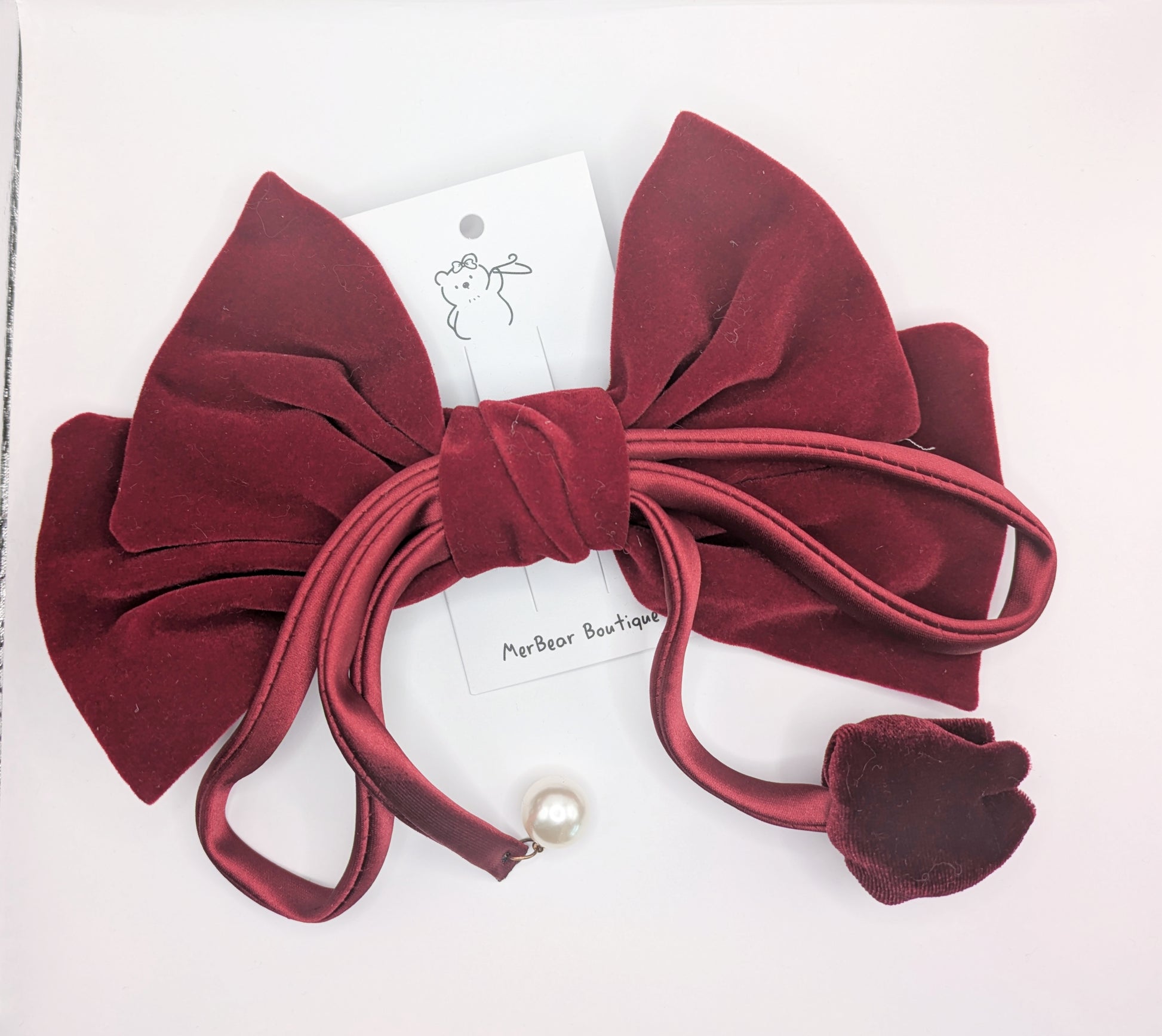 Make a bold and graceful statement with our Velvet Rose Statement Bow in rich burgundy. This luxurious oversized bow features soft velvet material, long satin tails, and a charming velvet rose bud accent finished with a faux pearl tip.